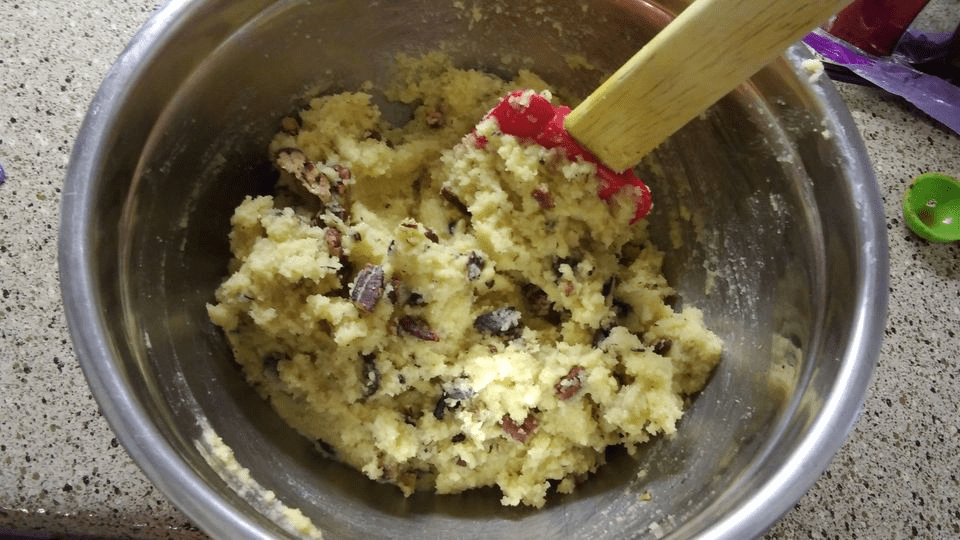 - Now add chopped nuts and chocolate pieces to the dough.