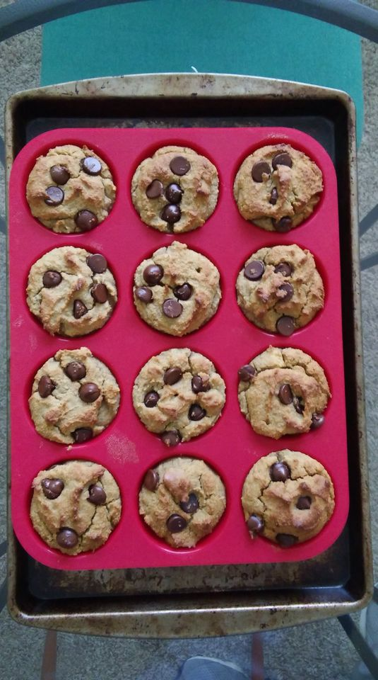 - The batter makes 12 muffins. So in a oiled muffin tin place 12 scoops of the batter, add 4 chocolate chips to each muffin top and bake in the oven for 20 minutes.