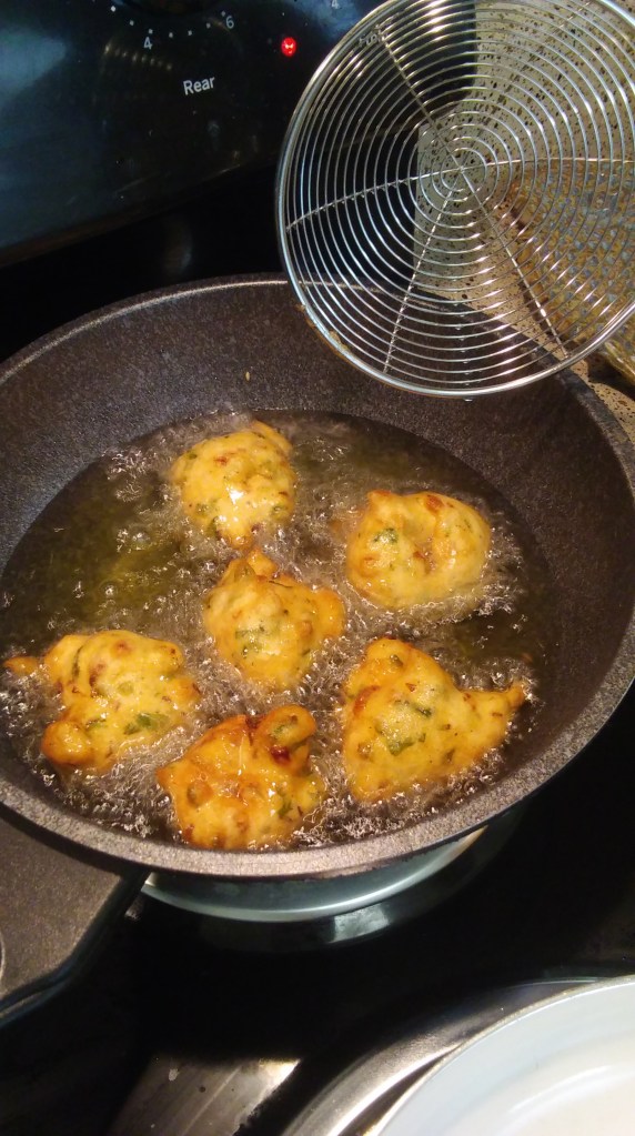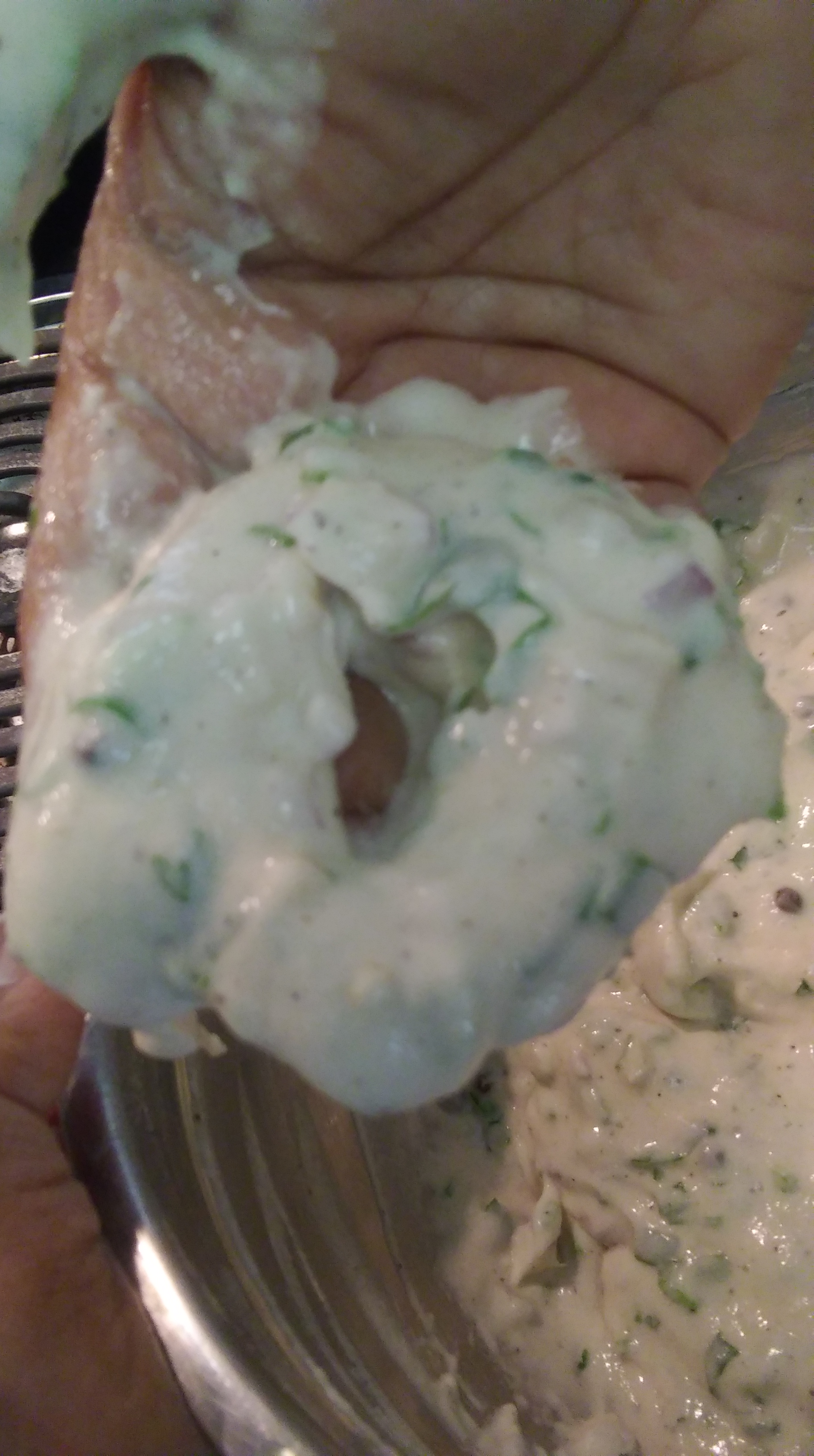 4. Heat a frying pan with oil on medium high. 5. When the oil is hot beat the dough by hand gently in a circular motion and take a ball of dough, pat the ball lightly and make a small hole in the center and drop it gently into the hot oil. ( see picture) Everytime you have to beat the dough by hand in a circular motion in the bowl before making the balls so that you incorporate air into the dough and it will make your savory donuts soft and light.