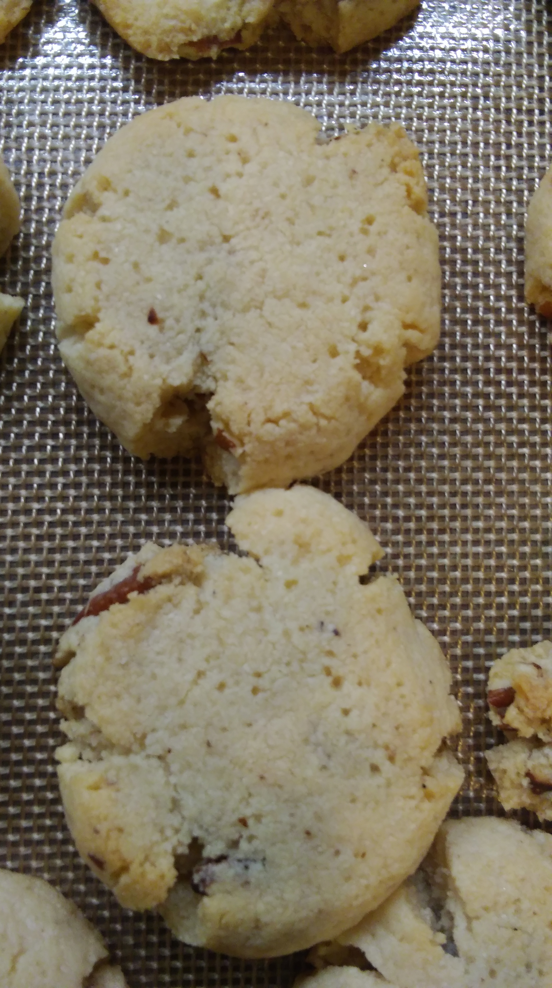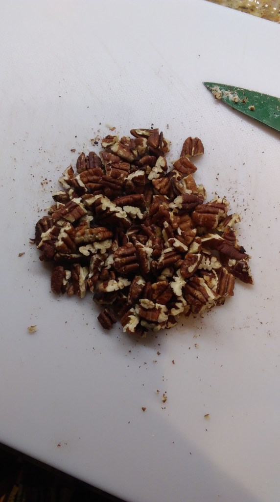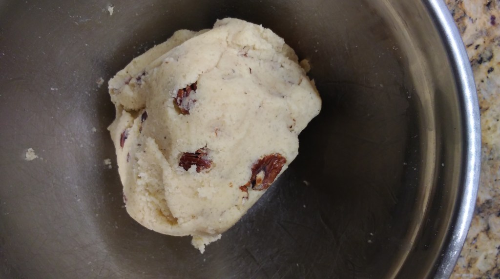Toast 1/2 cup of pecan nuts in a dry pan on the stove top at medium low heat till it becomes dark brown and lets out a delicious aroma. Chop the nuts after they cool. Add the chopped pecan nuts to the dough and fold them in.