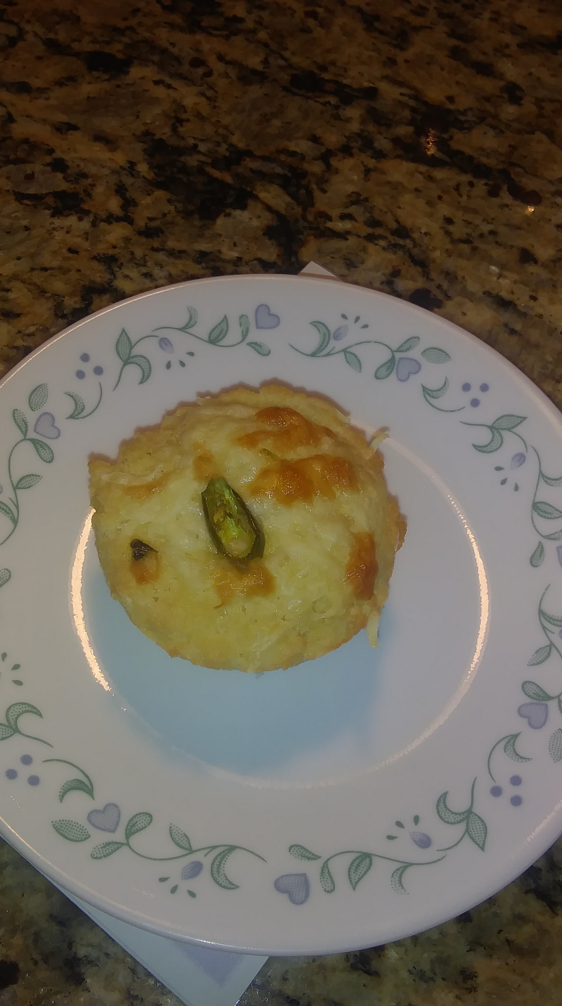 4. Add the eggs, butter and almond milk to the mixture and mix them well with a spatula. Divide the mixture equally among the 12 muffin tins . Top the muffins with the remaining half cup of cheese and a slice of the jalapeno on top.