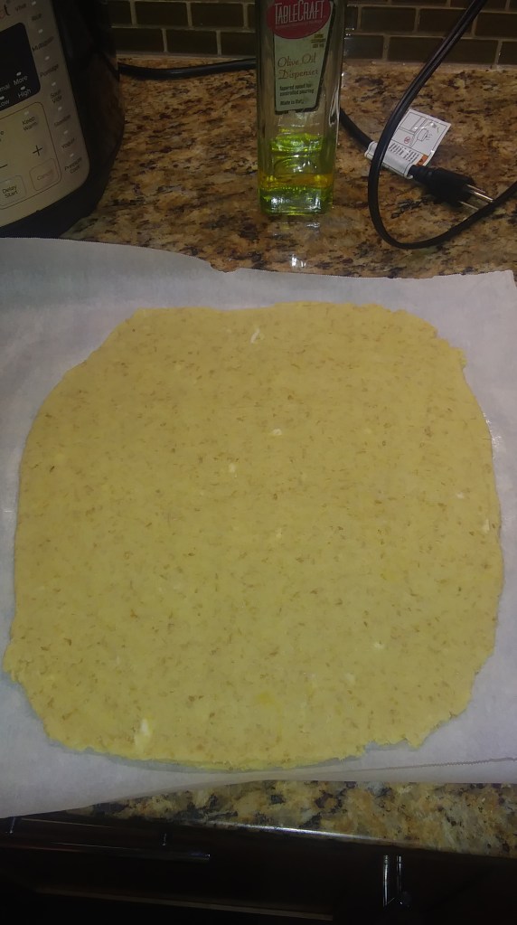 Now with oiled hands shape the dough into a ball and place it between two large parchment paper pieces and roll out the dough into a large rectangle.
