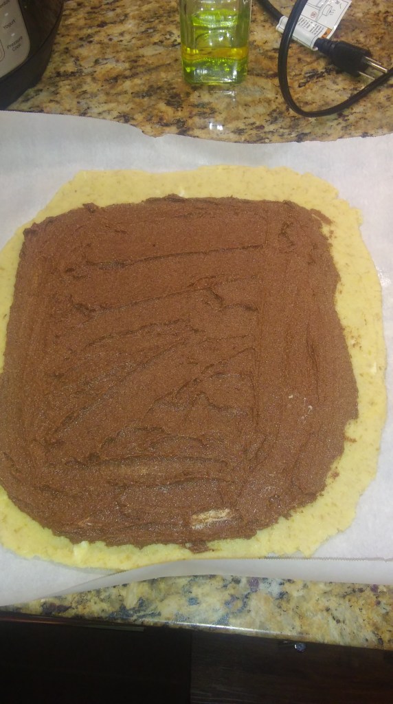 Now spread the cinnamon filling onto the dough leaving a 1 inch margin on all sides to give room for the filling to spread and not leak out of the dough.