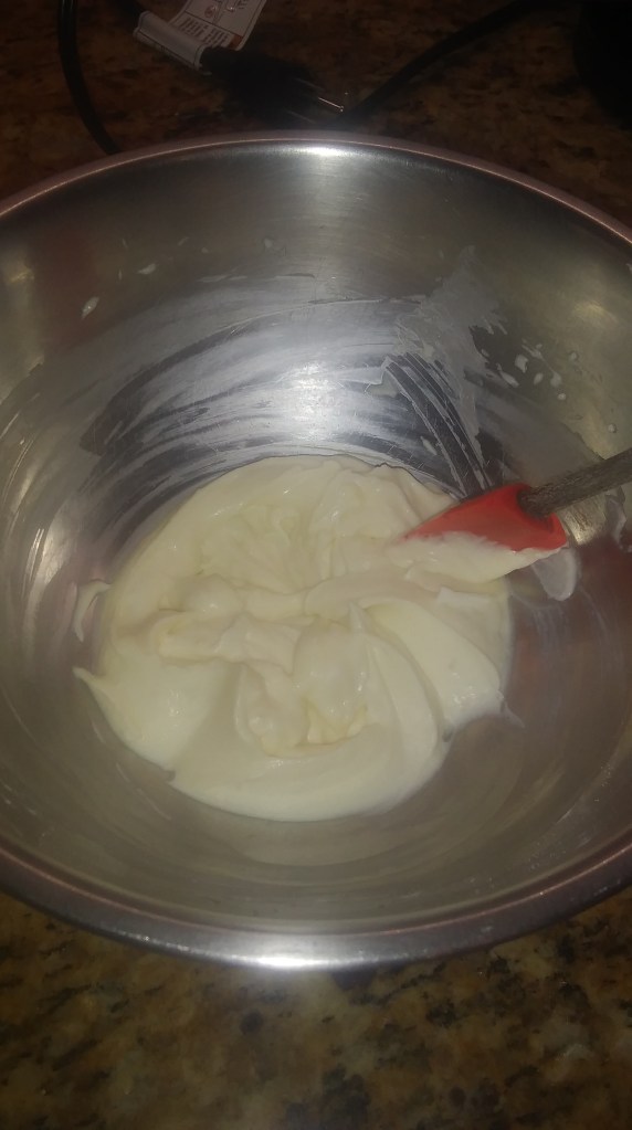 Make the frosting by combining with a mixer the softened butter, cream cheese, sweetener, heavy cream and vanilla until a thick , light, fluffy , spreadable frosting comes together.
