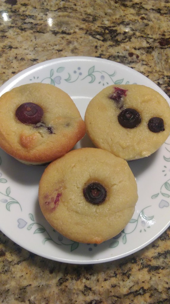 Fill the 12 muffin tins with the mixture, and place one or two blueberries on the top of the muffins, and place them in the preheated oven and bake for 25 minutes.