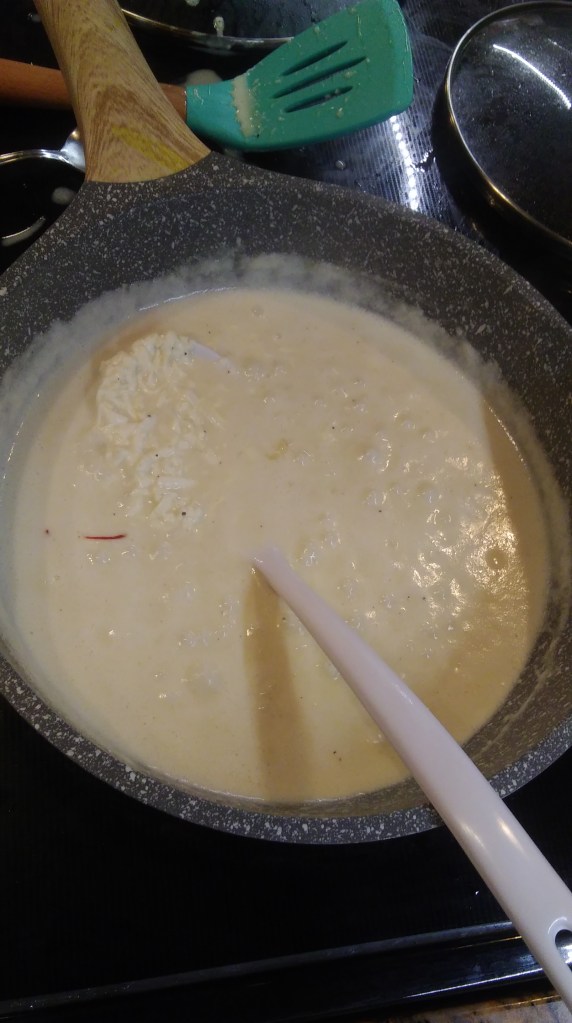 In a deep pan heat the coconut milk with the sweetener, saffron and cardamom powder.