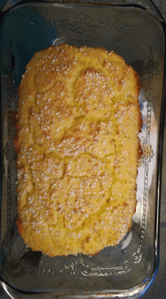 In a greased loaf pan transfer the dough and sprinkle sesame seeds on the top.