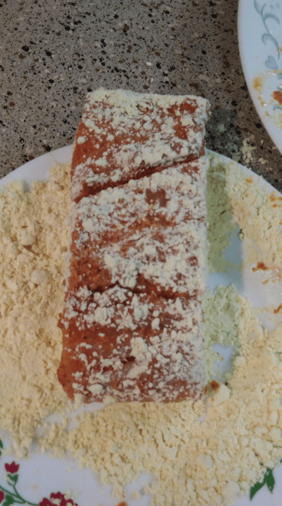 In a large bowl or plate add the dry gram powder or protein powder, keep it ready on the side to coat the fish pieces before you fry them.