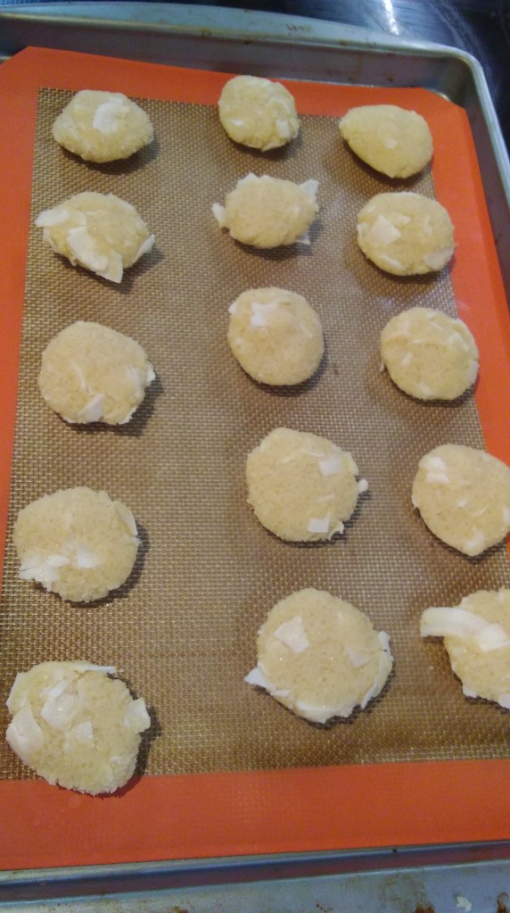 In a large bowl add the almond flour, sweetener, vanilla and butter and mix them well till a thick dough is formed. Now add the 1/2 cup of coconut flakes and mix the dough well.