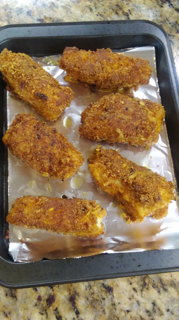 Remove from the oven and enjoy your crispy breaded fish which is low carb and delicious.