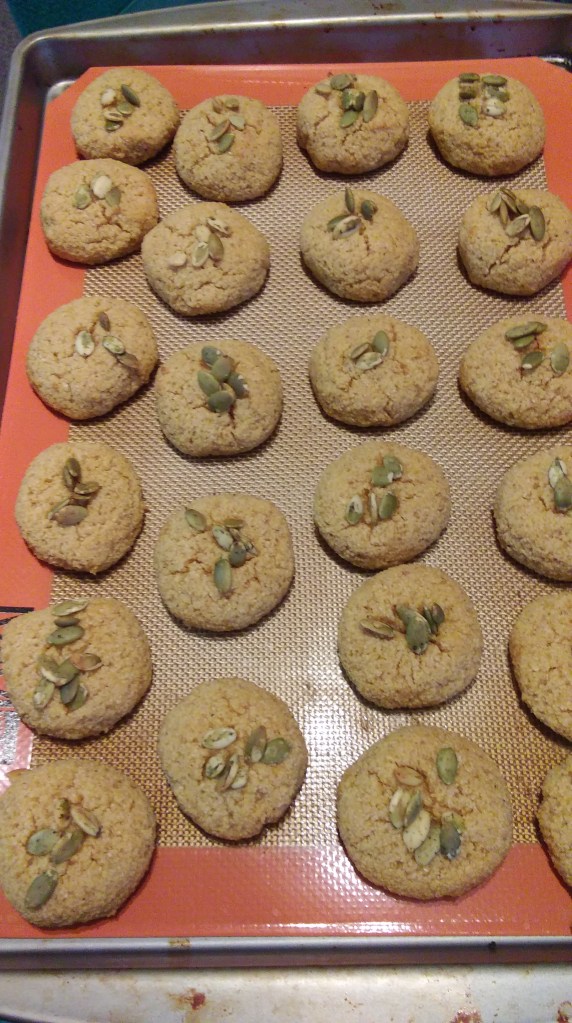 Make small balls of the dough and flatten to form a cookie shape. Place on the cookie sheet. Place them about an inch apart from each other so that they will have room to expand. Decorate each cookie with a few pumpkin seeds on the top.