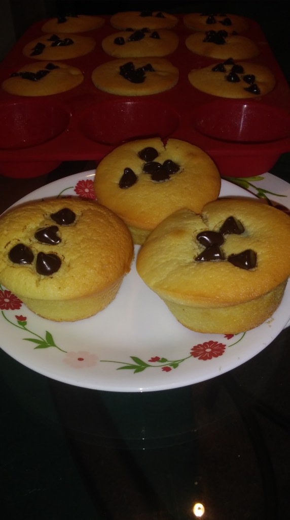 Now equally distribute the batter to the 12 muffin tins. Garnish a few chocolate chips on the top before placing in the oven.
