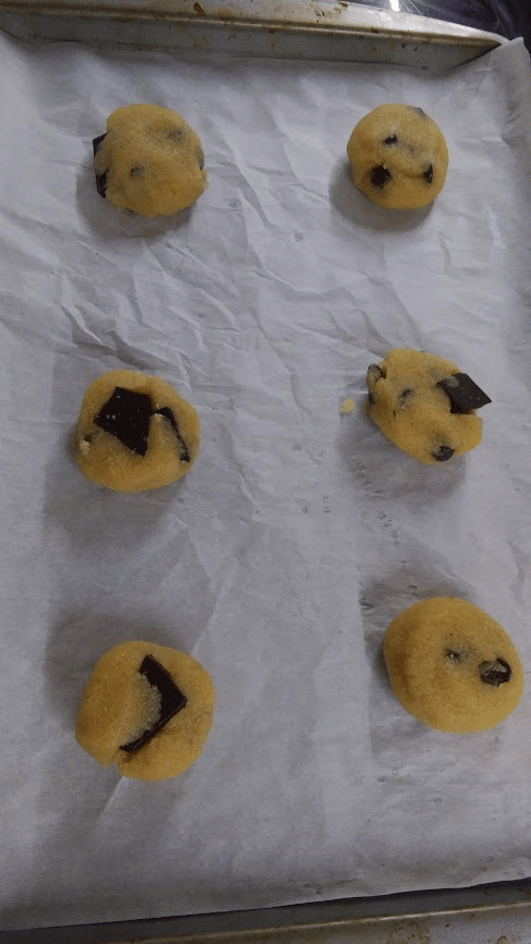 Now make 1 1/2 inch dough balls and press them gently between your palms to about 3/4 inch thick and place on the prepared baking sheet.