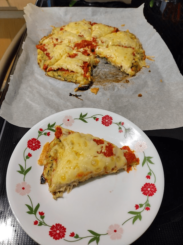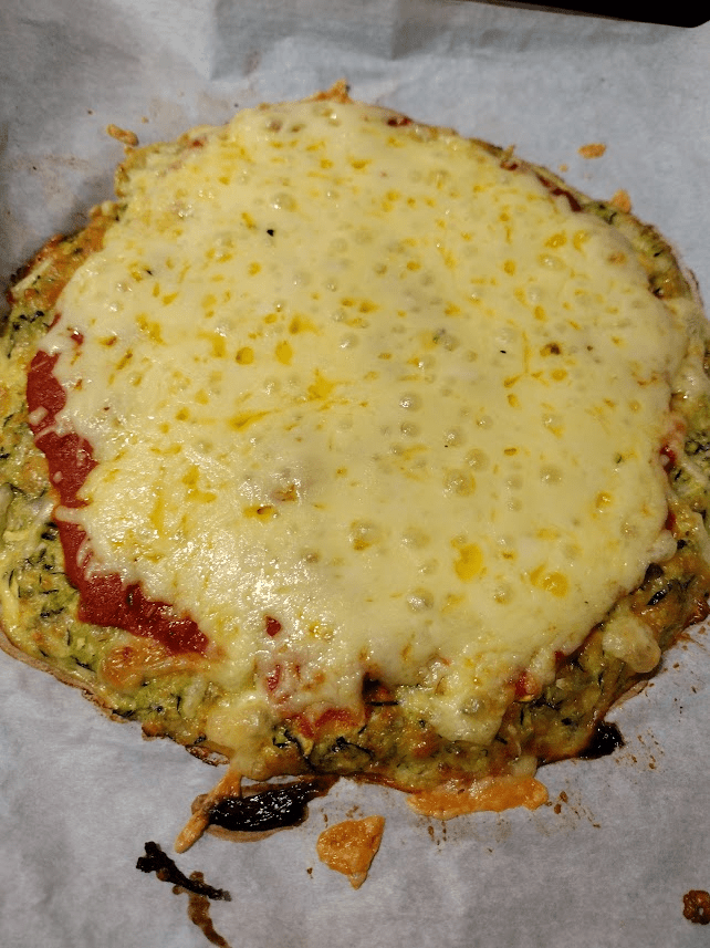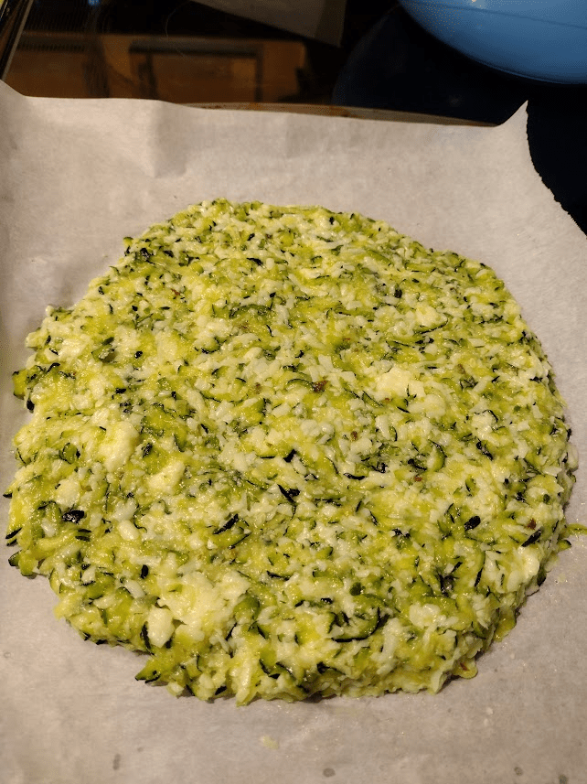 Now place the crust into the preheated oven and bake for 20 – 22 minutes until the crust has firmed up. Remove from the oven. You can also cut and eat this as a zucchini bread or you can go ahead and make it into a pizza by adding your toppings.