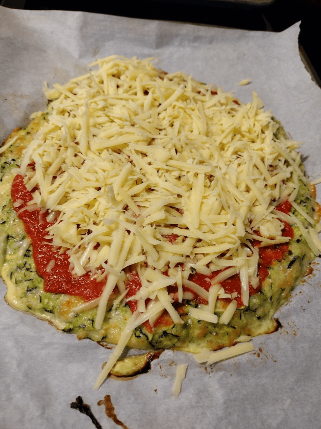 Add your favorite sugar free pizza sauce and a cup of grated mozzarella cheese on top of the pizza crust, and place it again in the 400 degree oven for 10 minutes till the cheese melts.
