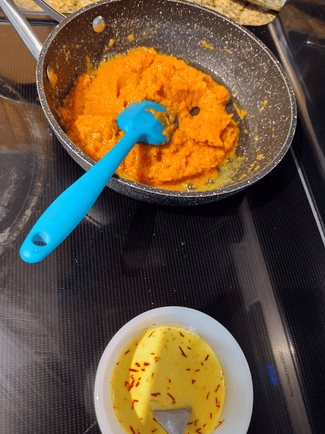 Keep the heat on medium and add the cream with the saffron to the pumpkin puree. Be careful as it will start to splash as you mix it. Allow this mixture to cook, close the pan with a lid. Carefully open the lid and mix the mixture now and then. The hot gooey mixture will start bubbling and splashing, so be careful and keep the heat in medium through out the cooking process and keep stirring now and then.