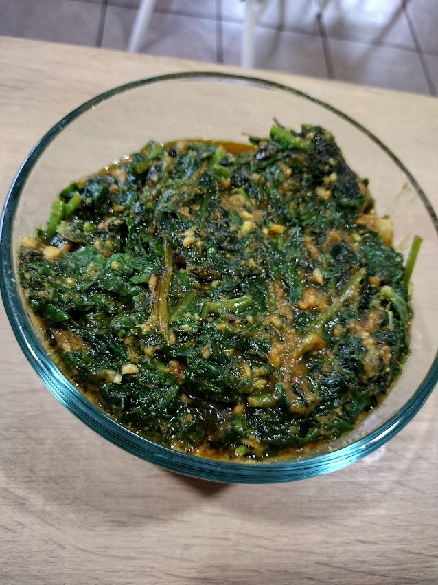 Now reduce the heat even more. Coarsely powder the peanuts in a mixer and add this to the spinach mixture. Move with a spatula till well combined.